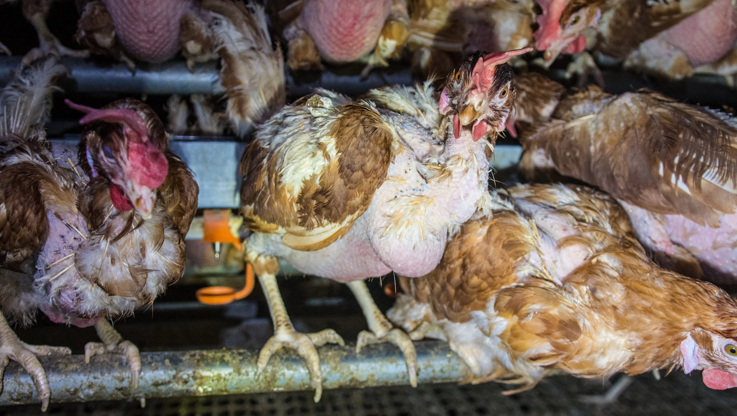 This hen is missing most of the feathers on her back, the victim of attacks by other birds at the Costco cage-free egg supplier’s farm.