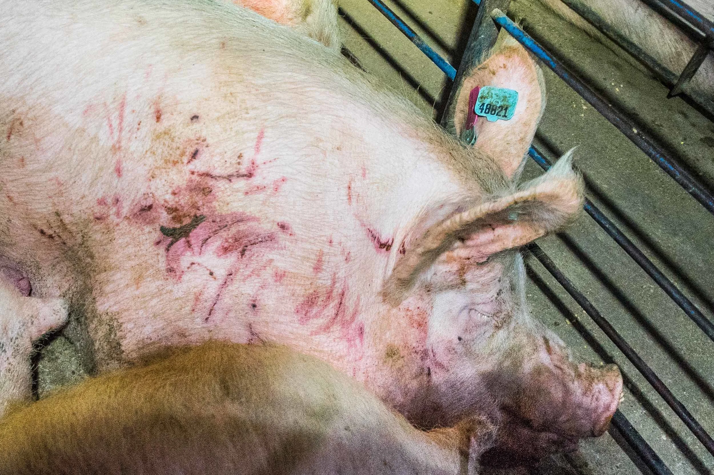 With wounds still fresh from the harsh conditions and constant fighting, a mother pig lays resigned in the dirt.