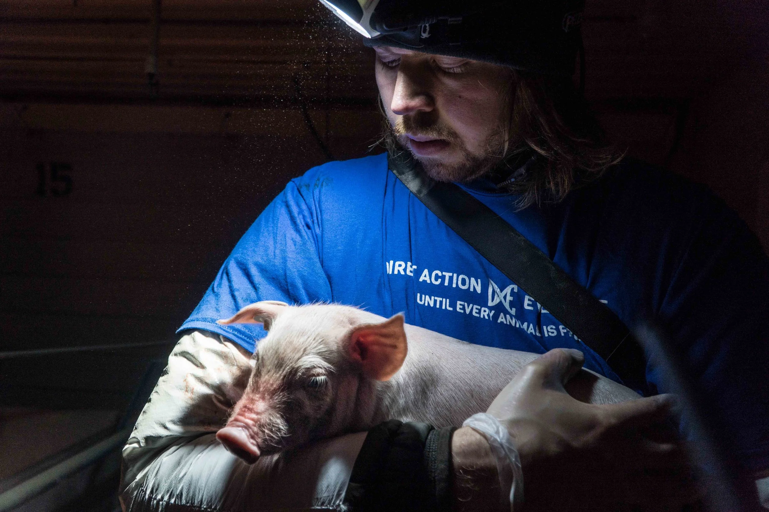 Wayne Hsiung, co-founder of DxE, brings carries a diseased piglet to safety.
