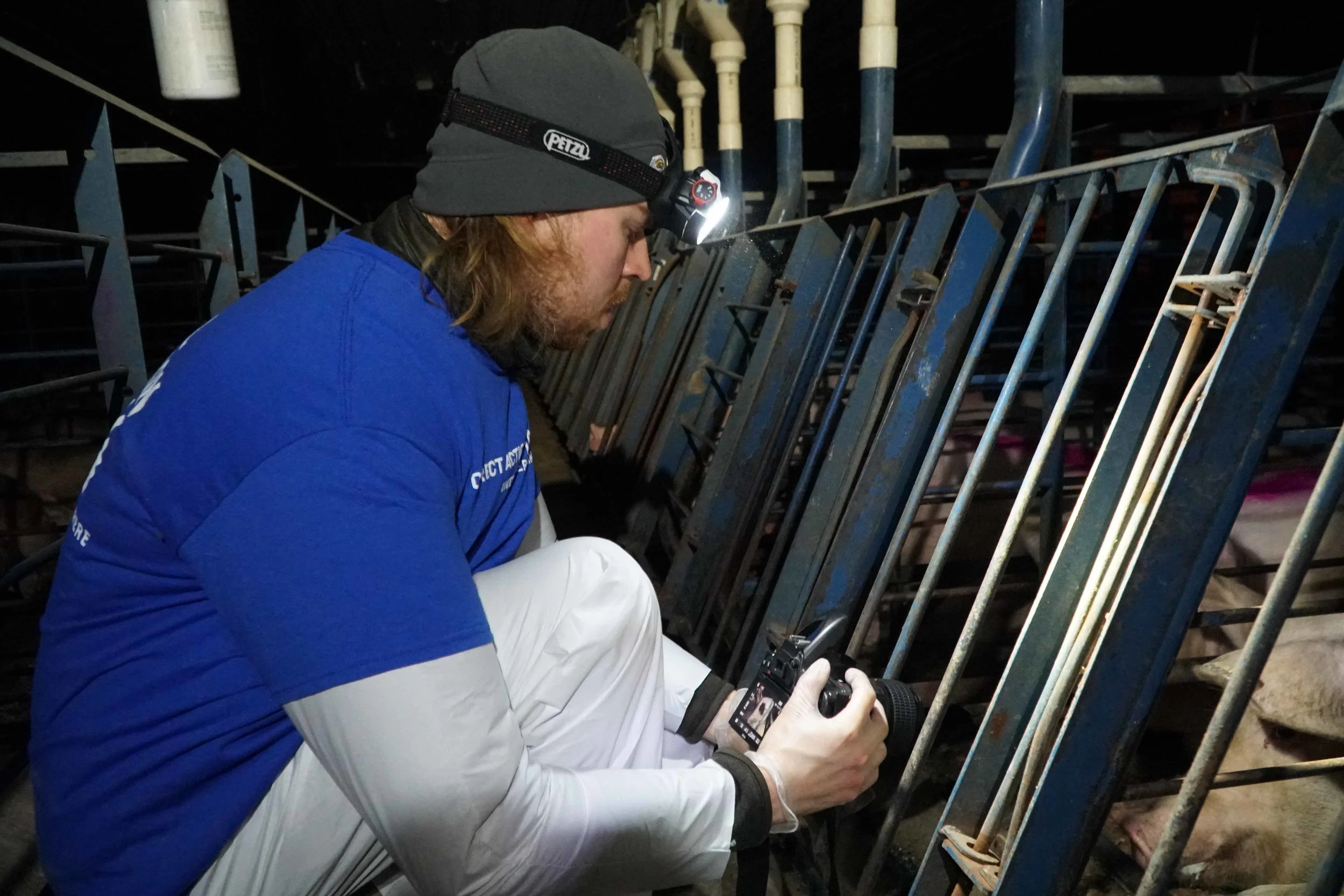 DxE Activists Jon Frohnmayer and Paul Darwin Picklesimer document the inside of a pig-rearing facility.
